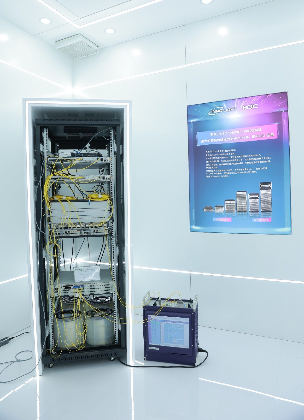 使用了旭創(chuàng)科技最新400G ZR/OpenZR+ QSFP-DD DCO模塊,其最大亮點(diǎn)是實(shí)現(xiàn)了相干光模塊的互通性操作,使交換機(jī)直接發(fā)射彩光,對(duì)降低數(shù)據(jù)中心互聯(lián)的網(wǎng)絡(luò)復(fù)雜性、能耗和成本具有重要意義。