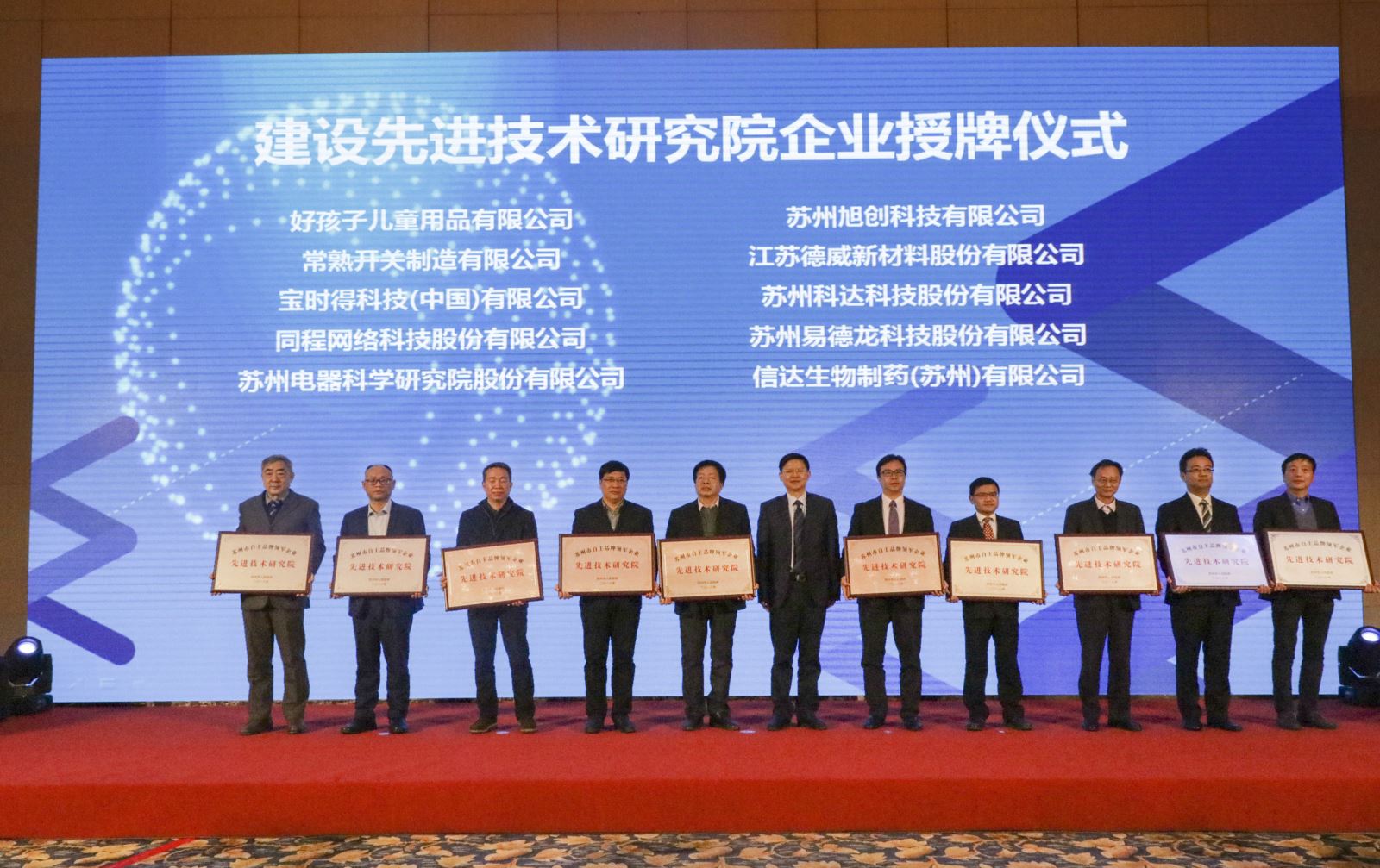On February 28, 2018, Mayor Li Yaping awarded licenses to the first batch of 20 large enterprises with independent brands and leading enterprises for the construction of institutes of advanced technology in Suzhou.